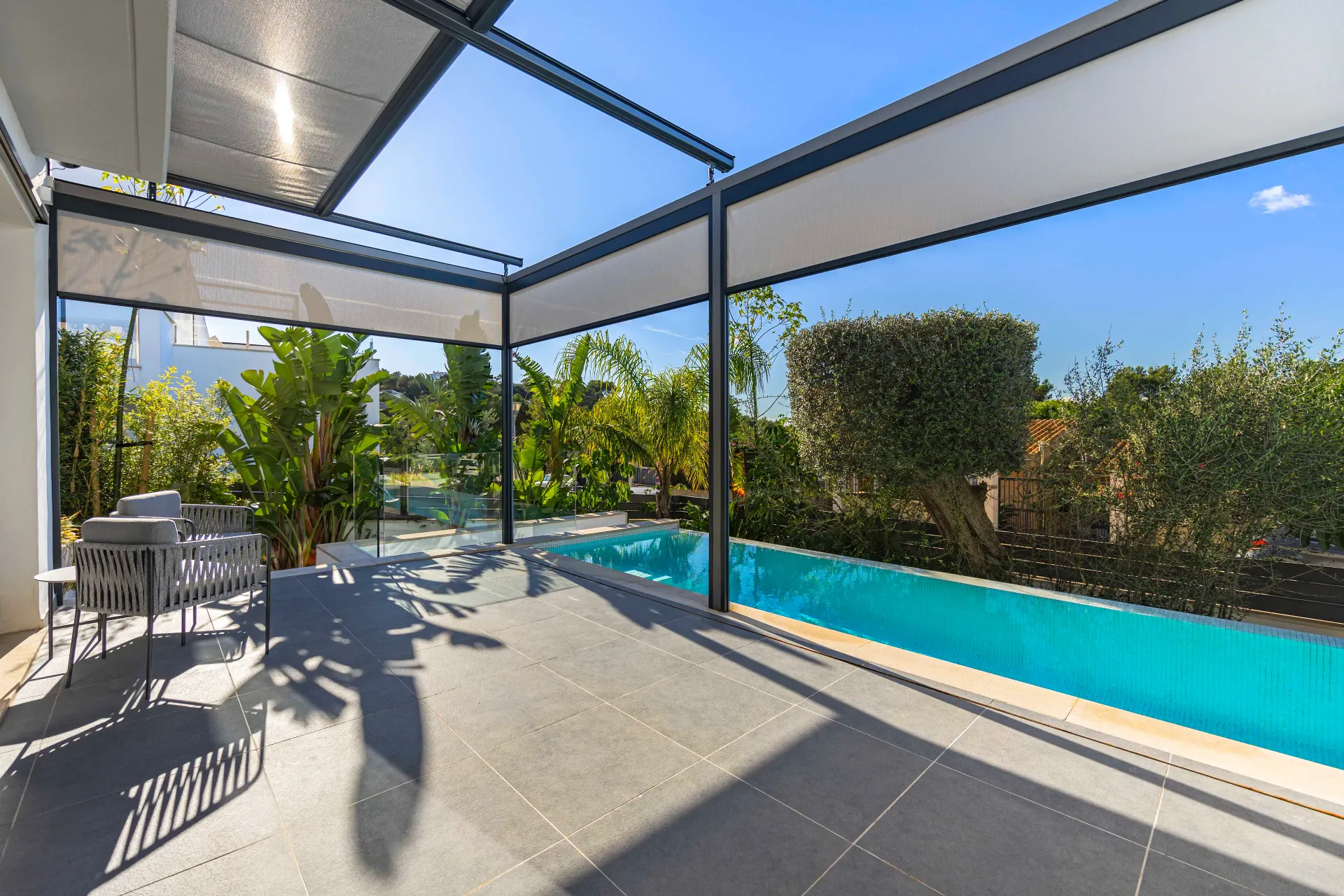 Die großzügigen Terrassen- und Außenbereiche bieten viel Platz für das Leben unter freiem Himmel.
